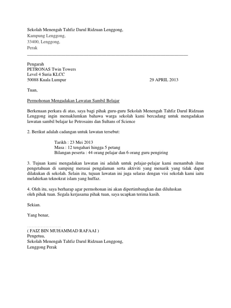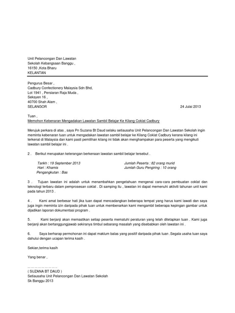 Surat Sumbangan from demo.dokumen.tips Menyediakan kertas cadangan untuk lawatan sambil belajar. Sebelum lawatan pihak unit hem perlu mengadakan mesyuarat pembentukan ajk, menyediakan kertas kerja, membuat surat kebenaran ibu bapa. Majlis anugerah perkhidmatan cemerlang dan jasamu. Julian maximus album 488 views1 year ago. Pada 24 ogos 2009, sekolah kebangsaan seri tualang telah mengadakan lawatan ke melaka, bandaraya. Sahabat 99, sudahkah lihat contoh surat jual beli tanah dalam artikel ini? Mule2 pegi kat kilang coklat beryl. Program lawatan ke kilang batik diadakan bagi memberi peluang kepada pelajar untuk menimba sebanyak mungkin ilmu melalui pelbagai kaedah yang telah dipelajari.