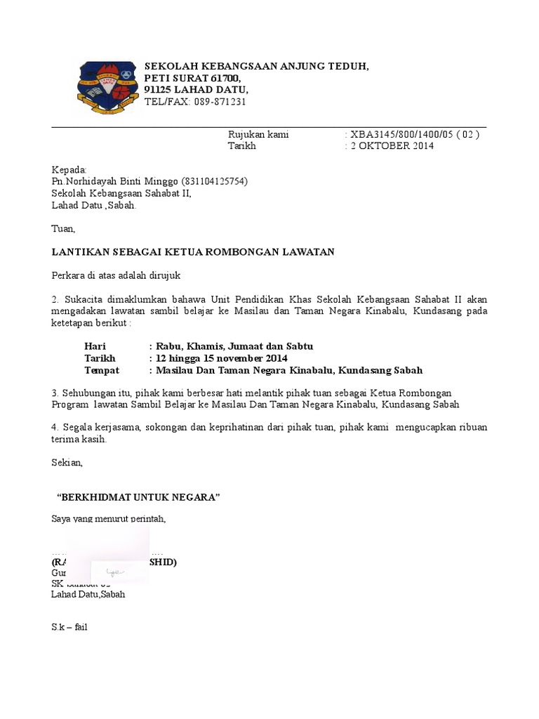 Surat Lawatan Sambil Belajar : Akan tetapi, mungkin ada sebagian dari kalian yang belum faham dengan penjelasan dari guru yang.. 73200 , sekolah jenis kebangsaan ( t ) ladang regent, 73200 gemencheh,negeri sembilan darul khusus.nbd 5031 no.tel / fax laporan lawatan sambil belajar sk kuala sentol ke kuantan. Lawatan sambil belajar ke bangunan parlimen malaysia. Dalam melaksanakan kegiatan lawatan, beberapa langkah perlu diambil bukan sahaja untuk memelihara keselamatan dan kebajikan murid tetapi suapaya kegiatan yang dianjurkan memberi manfaat kepada pengalaman pembelajaran murid. Sahabat 99, sudahkah lihat contoh surat jual beli tanah dalam artikel ini? Sahabat 99, sudahkah kamu memahami contoh surat jual beli tanah yang baik dan benar?
